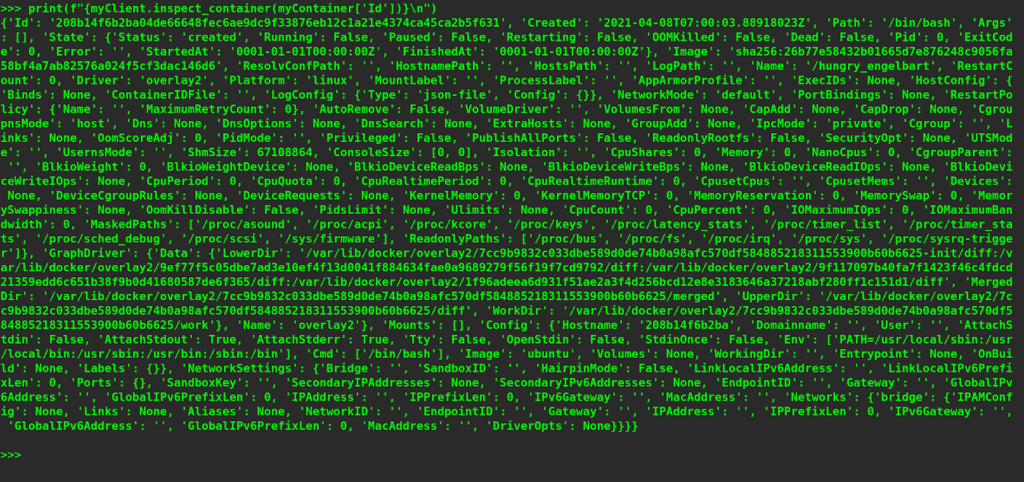 print(f"{myClient.inspect_container(myContainer['Id'])}\n")