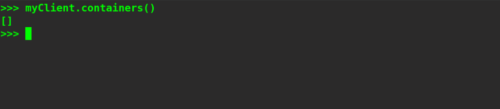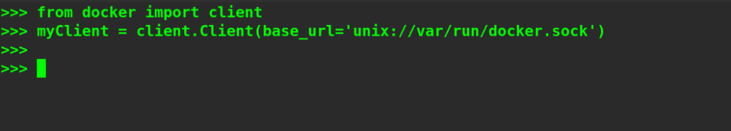 Here, we have imported the client from the docker module. Then, we have created a client object and specified the path of the Docker socket to that object so that it can connect to the daemon.