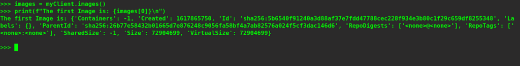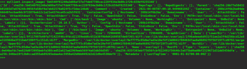 Similar to inspecting containers, we can invoke the inspect_image command on the client object and pass the image ID of the image that we want to inspect as an argument. For example, let’s try to inspect an image with ID