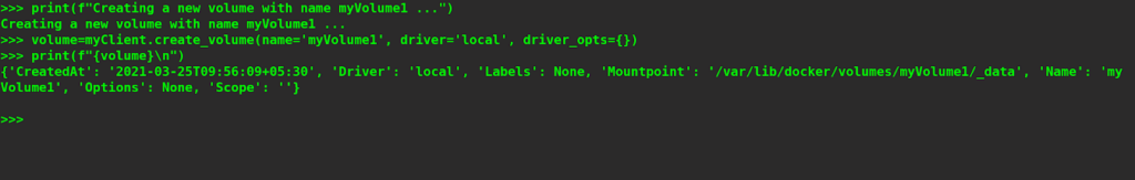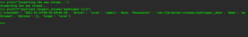 Inspecting a volume is similar to inspecting containers and images, we just need to specify the name of the volume as an argument to the inspect_volume method invoked on the myClient object. Let’s try to inspect the volume called myVolume1.