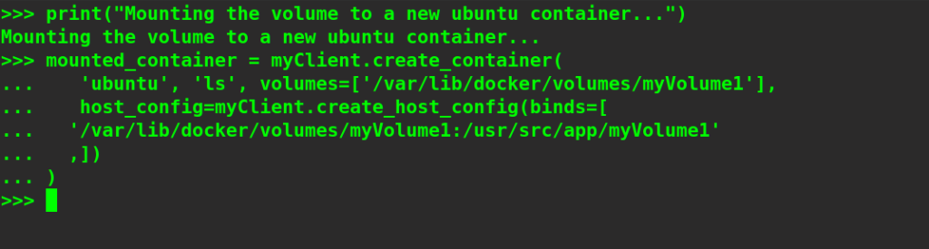 We can directly mount a volume to a new container while creating it. If the volume does not already exist, it will get created. We need to pass the path of volume in the host machine and create a host config within the command by using the create_host_config method in which we will pass bind options such as source and destination paths of the volume. Let’s try to create an Ubuntu container with myVolume1 mounted on it.
