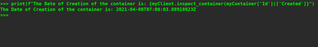 print(f"The Date of Creation of the container is: {myClient.inspect_container(myContainer['Id'])['Created']}")