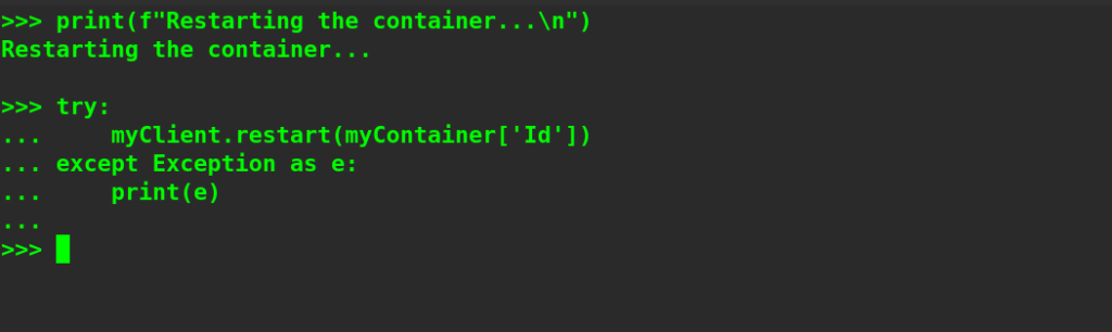 You can restart a container using the restart method on the client object by passing the container ID as an argument. However, we need to make sure that the container is actively running if we want to restart it. That’s why we need to wrap it inside the try-except blocks.