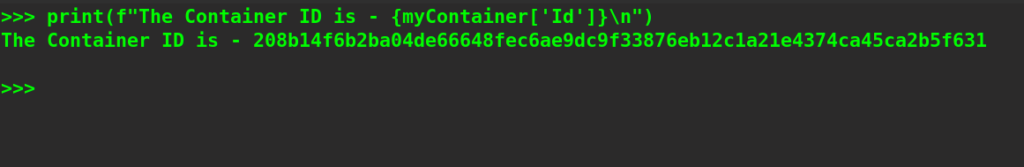 print(f"The Container ID is - {myContainer['Id']}\n")