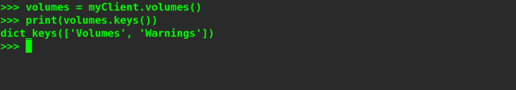 volumes = myClient.volumes() print(volumes.leys())