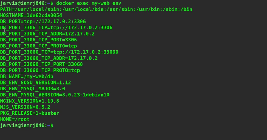 Here, you can see the name of the source container, target container, and the link alias. 5. Now, check the created environment variables in the ‘my-web’ container using below command.