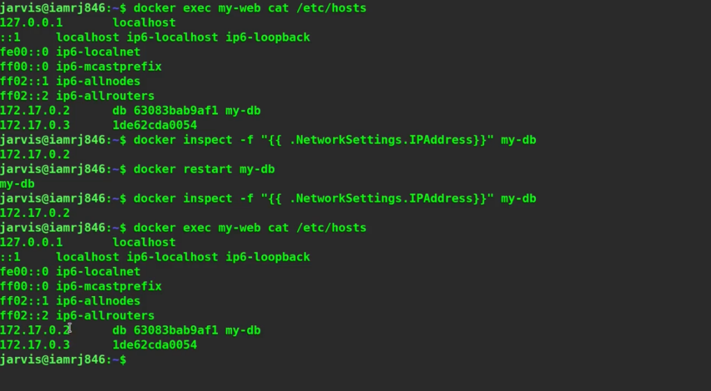 , we will see the IP Address entry of the ‘my-db’ container and the ‘db’ for the link name. We will restart the ‘my-db’ container and check the IP address and it is the same as earlier if IP Address of the ‘my-db’ container gets changed then that will be updated in the ‘/etc/hosts’ file.