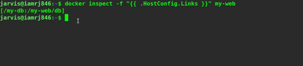 $ docker inspect -f "{{ .HostConfig.Links }}" my-web