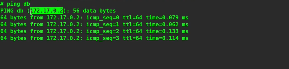 7. Finally, let’s try to ping the ‘my-db’ container using the link alias, and container name.