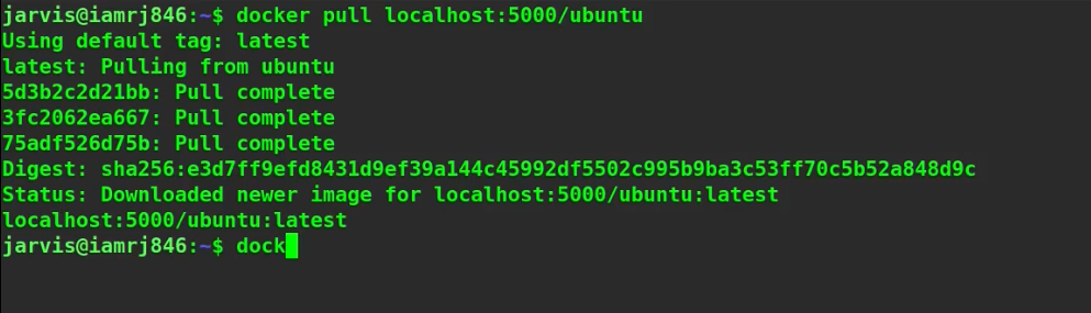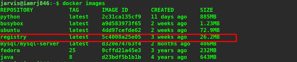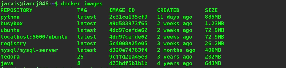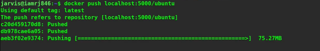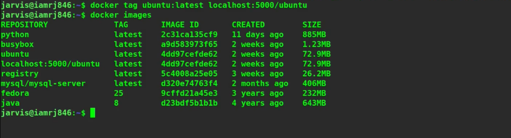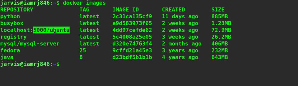 Here, we have tagged the latest ubuntu image to the localhost:5000 tag. So the final image will be localhost:5000/ubuntu where localhost:5000 is the repository name and ubuntu is the image name.