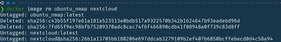 When we execute the docker image ls command, we get a list of images along with their names and image IDs that can be used to remove them. Now, let's remove the ubuntu_nmap image and the nextcloud image.