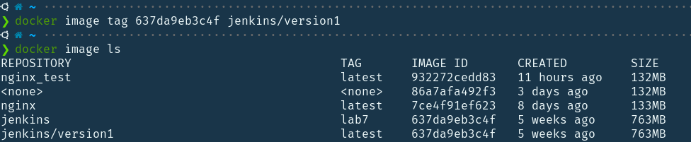 We can see in the above image that there are two images, the first one is the original Jenkins image and the second one is the image that we created just now with a new tag. You can also use the image name instead of the image ID and usually the repo name used is the username of docker hub, stating that it belongs to your repository.