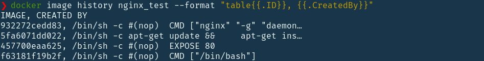 Let’s use the format option to get only the image ID and which instructions have created it.