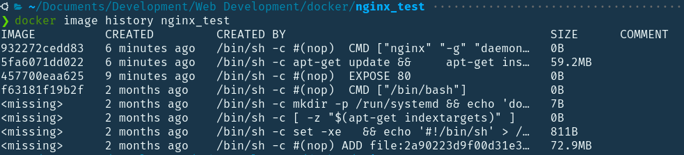 This lists out the history of intermediate layers while creating the final image. As you can see, there is an intermediate image for every instruction of the dockerfile. Options