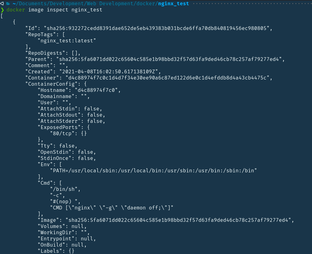 This command returns a JSON array that has details such as the Image ID, the parent image of this particular image, the repo-tags which we specified in the earlier section using -t. You can get the image name of the image use the below command: