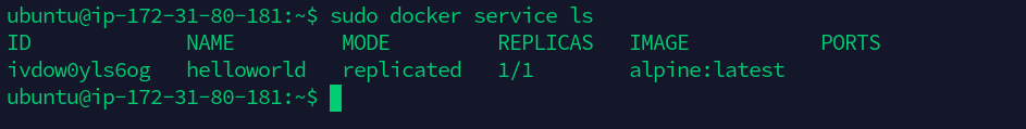 $ docker service create --replicas 1 --name helloworld alpine ping docker.com