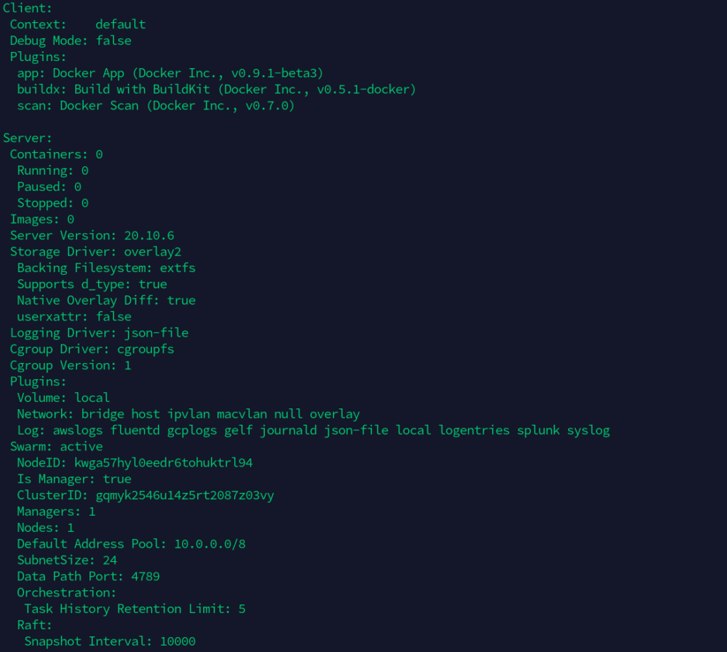 In the above output, we can see that there are no containers running on the docker server and the swarm flag is active. This also prints out the clusterId and number of managers and nodes, etc. To view information about nodes, we can use the following command.