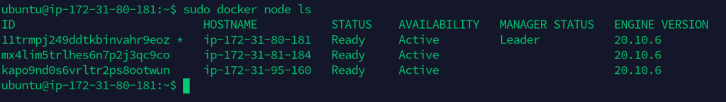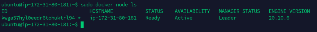 The * next to the ID represents that this is the node we are currently connected to. The swarm mode names the machine with a hostname automatically.
