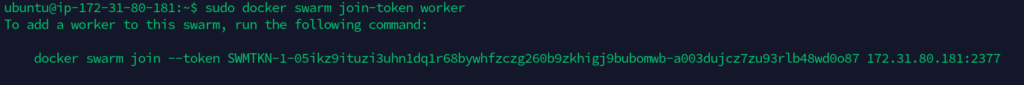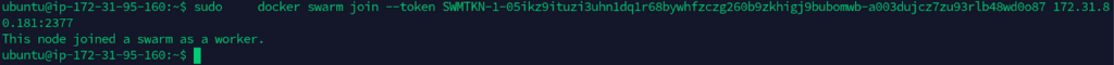 Now, it's time to add worker nodes to the above-created swarm cluster. For that, we need to ssh into the machine which we want to run as worker nodes. We must run the output of docker swarm init we got earlier in this worker terminal: