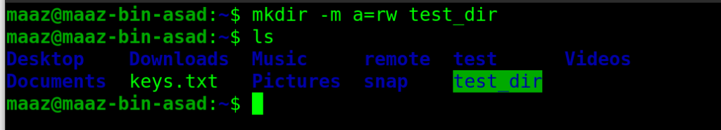 In the above example, we have created a directory named “test” and we got the message of successful directory creation.